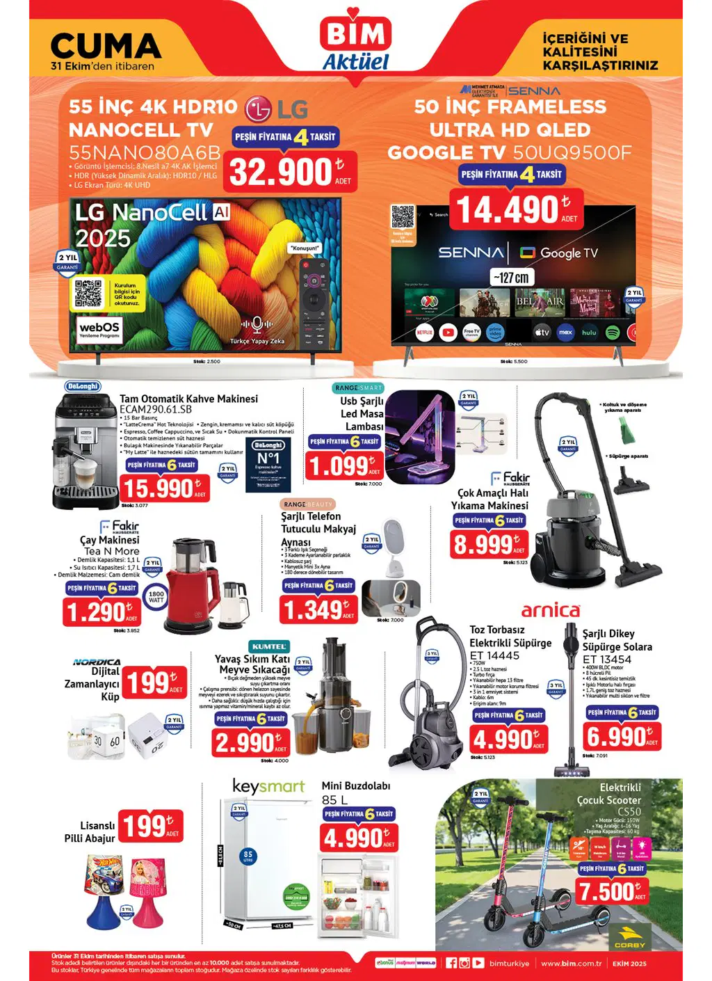 BİM, 31 Ekim'den itibaren geçerli olacak yepyeni aktüel ürünler kataloğuyla müşterilerine cazip fırsatlar sunuyor. Televizyonlardan küçük ev aletlerine, mutfak gereçlerinden giyim ürünlerine kadar geniş bir yelpazede, her evin ihtiyacını karşılayacak ürünler, uygun fiyatlarla raflardaki yerini alıyor. Sınırlı stoklarla sunulan bu özel fırsatları kaçırmamak için acele edin!