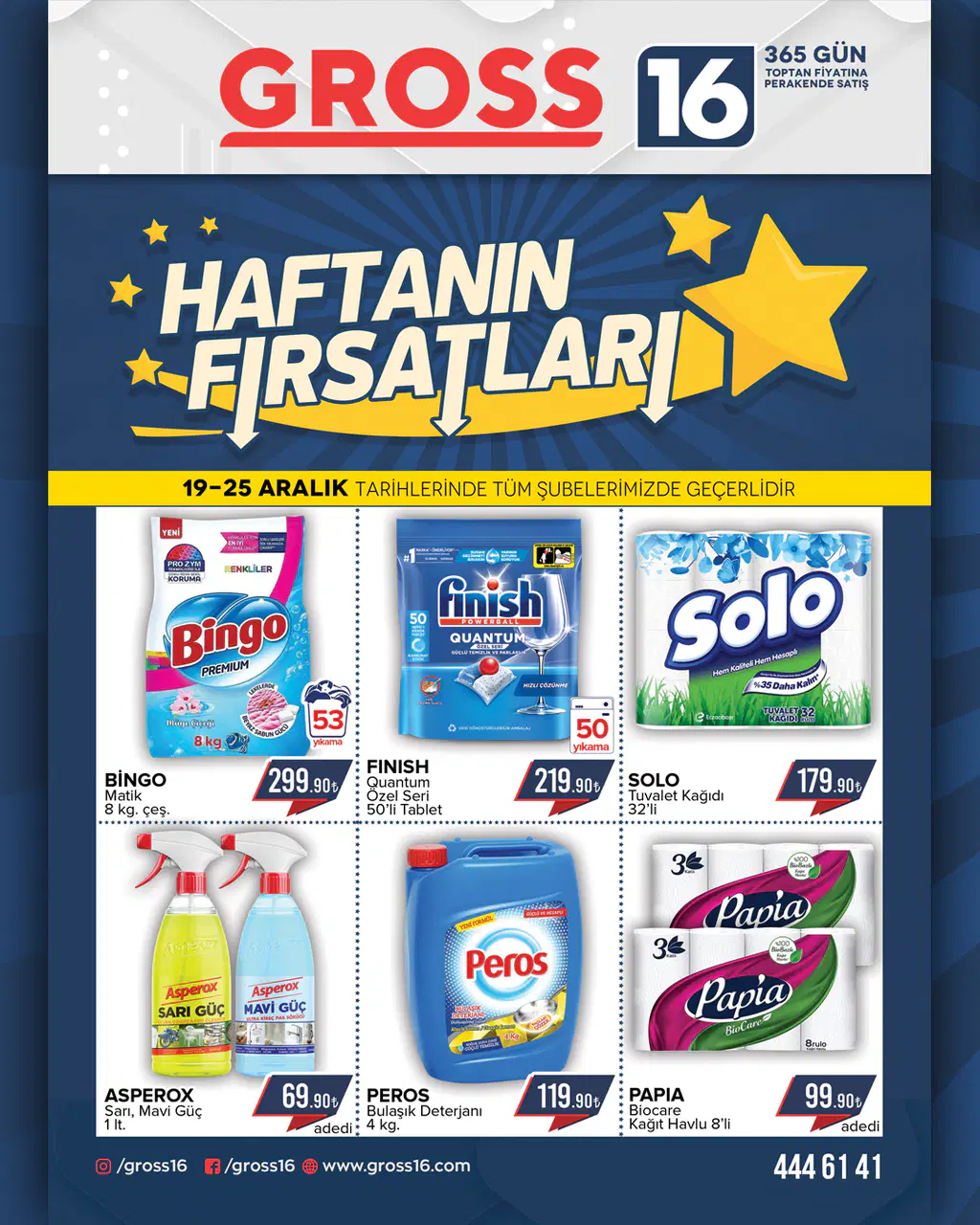 GROSS 16 marketlerinde 19.12.2025 tarihinden itibaren geçerli olacak haftanın aktüel ürünlerini kaçırmayın! Mutfak alışverişlerinizden temizlik ihtiyaçlarınıza kadar birçok üründe avantajlı fiyatlarla tasarruf edin.