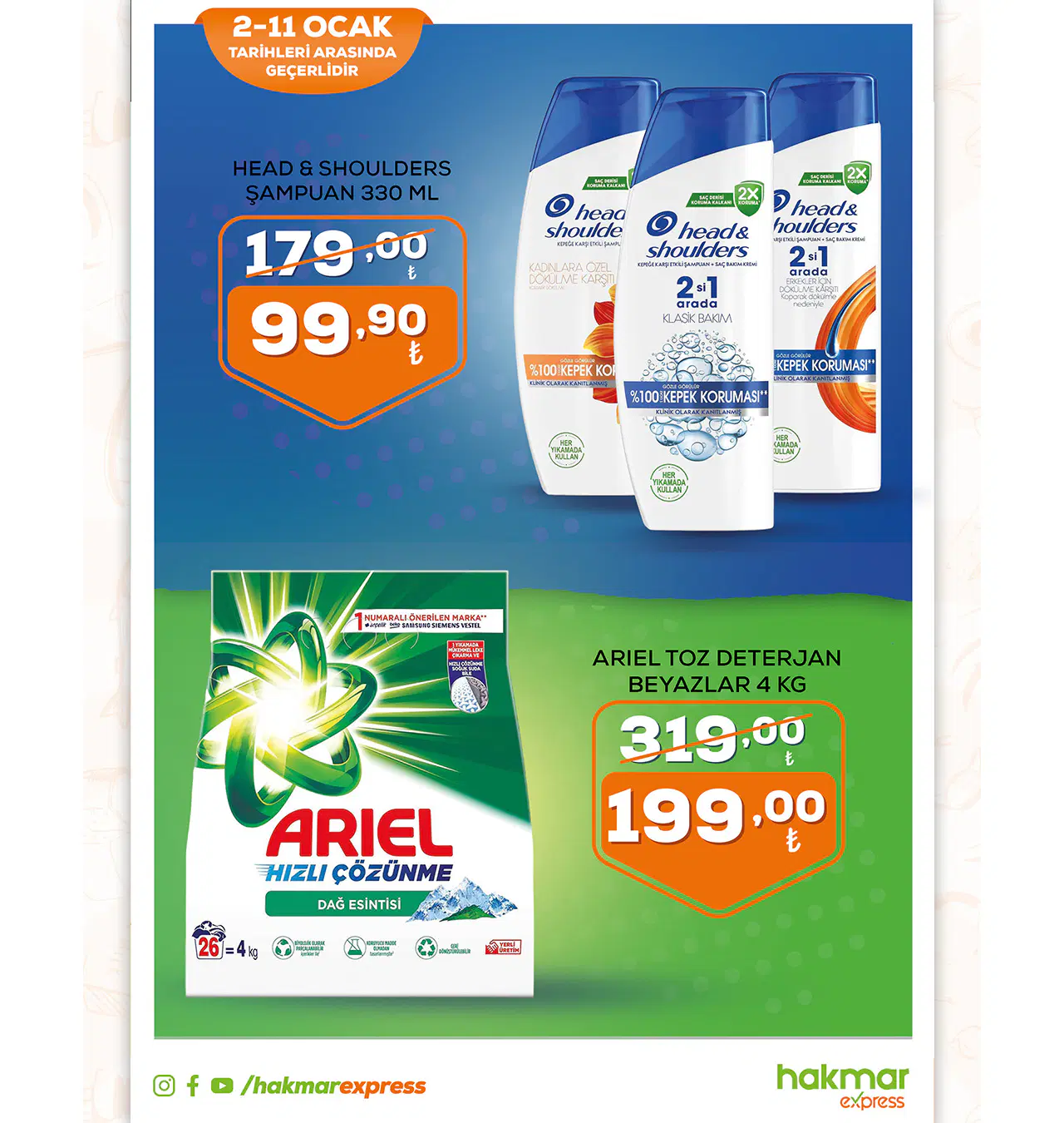 Hakmar Express, 2 Ocak 2026 ve 11 Ocak 2026 tarihleri arasında geçerli olacak yepyeni aktüel ürün kampanyalarını duyurdu. Bu hafta öne çıkan temizlik ve kişisel bakım ürünlerinde kaçırılmayacak indirimlerle bütçenize dost alışverişin keyfini çıkarın.