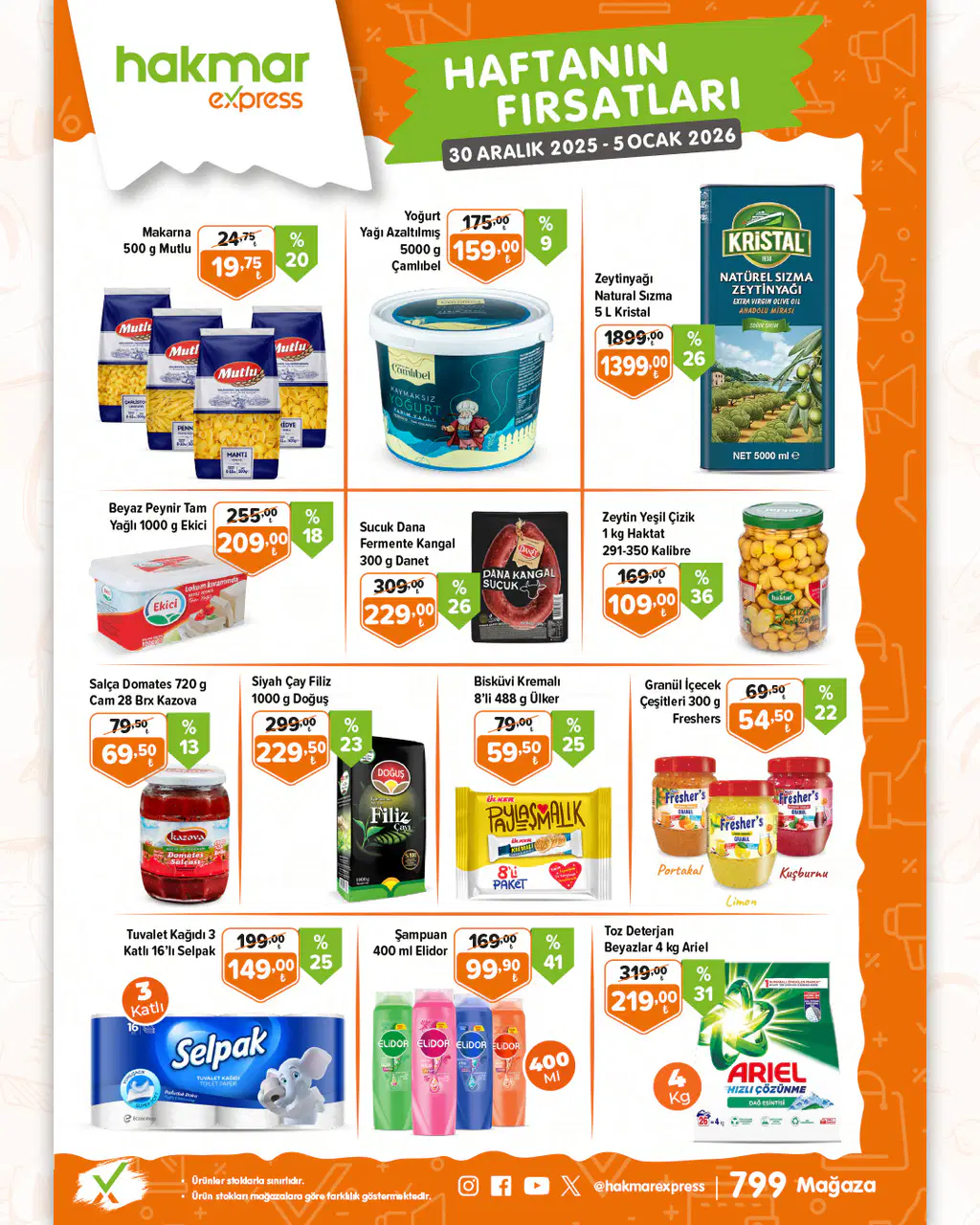 Hakmar Express'in bu özel kampanyası 30 Aralık 2025 tarihinde başlayıp 5 Ocak 2026 tarihine kadar devam edecektir. Stoklarla sınırlı bu fırsatları kaçırmayın.