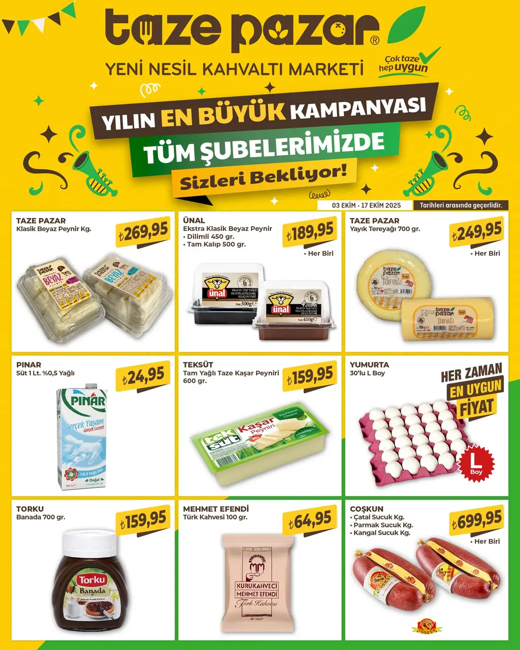 Taze Pazar, 03 Ekim - 17 Ekim 2025 tarihleri arasında geçerli olacak yılın en büyük kampanyasını duyurdu. Tüm şubelerde kahvaltılıklardan temel gıdalara, şarküteriden tatlılara kadar geniş ürün yelpazesinde cazip fiyatlar sunuluyor.